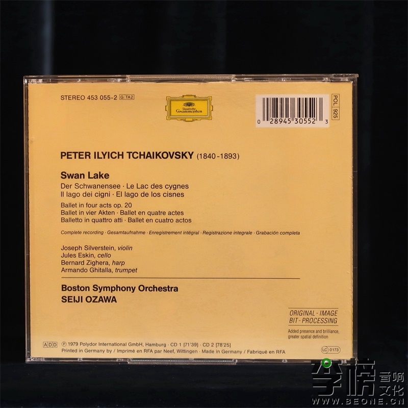 这张双 CD唱片收录了小泽征尔指挥波士顿交响乐团演奏的柴科夫斯基四幕芭蕾舞剧《天鹅湖》全曲,在当时对其录音及演绎都评价很高,但整体来讲“细腻有余、奔放不够”,或许这应该是小泽征尔指挥下的音乐风格吧……不过作为收藏和欣赏已足够了!